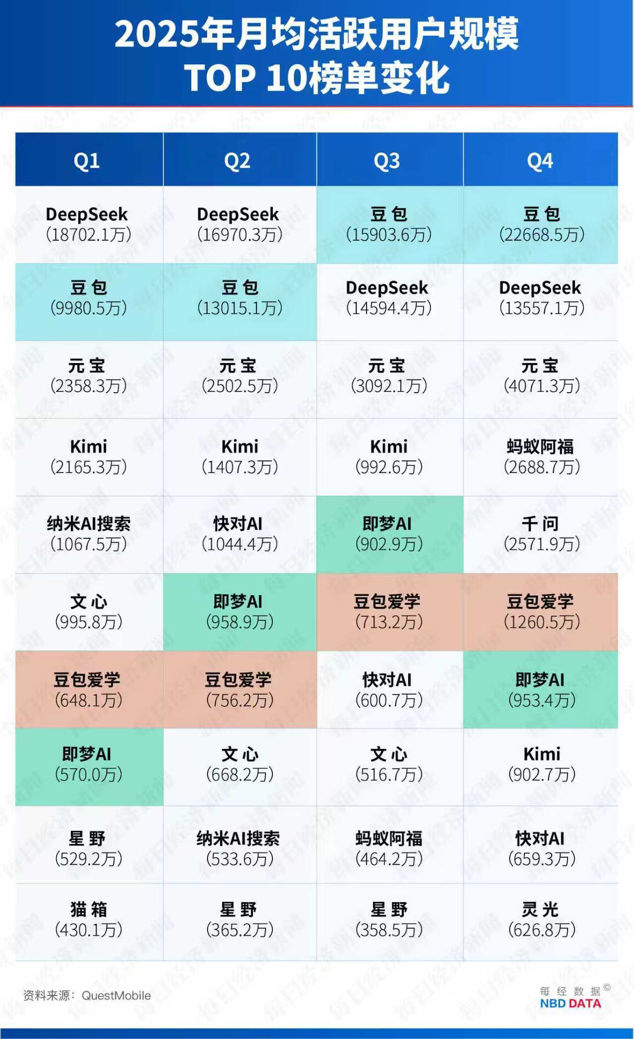 QuestMobile向《每日经济新闻》独家提供的数据显示,2025年第四季度,豆包App月活飙升至2.27亿,稳居行业第一,也是国内首个日活破亿的AI原生应用。