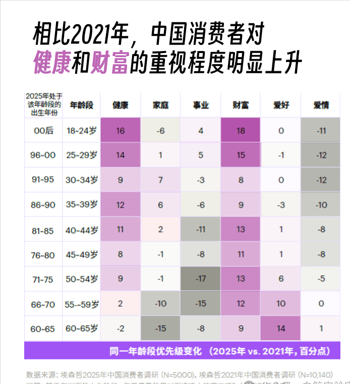 普遍倦怠的社会情绪下,关注确定性高的自我和健康,成为当代人应对焦虑的有效方式。埃森哲的调研数据也反映出这一点,相比2021年,现在人们对健康和财富的重视程度明显上升,对事业的重视程度则大幅下降。