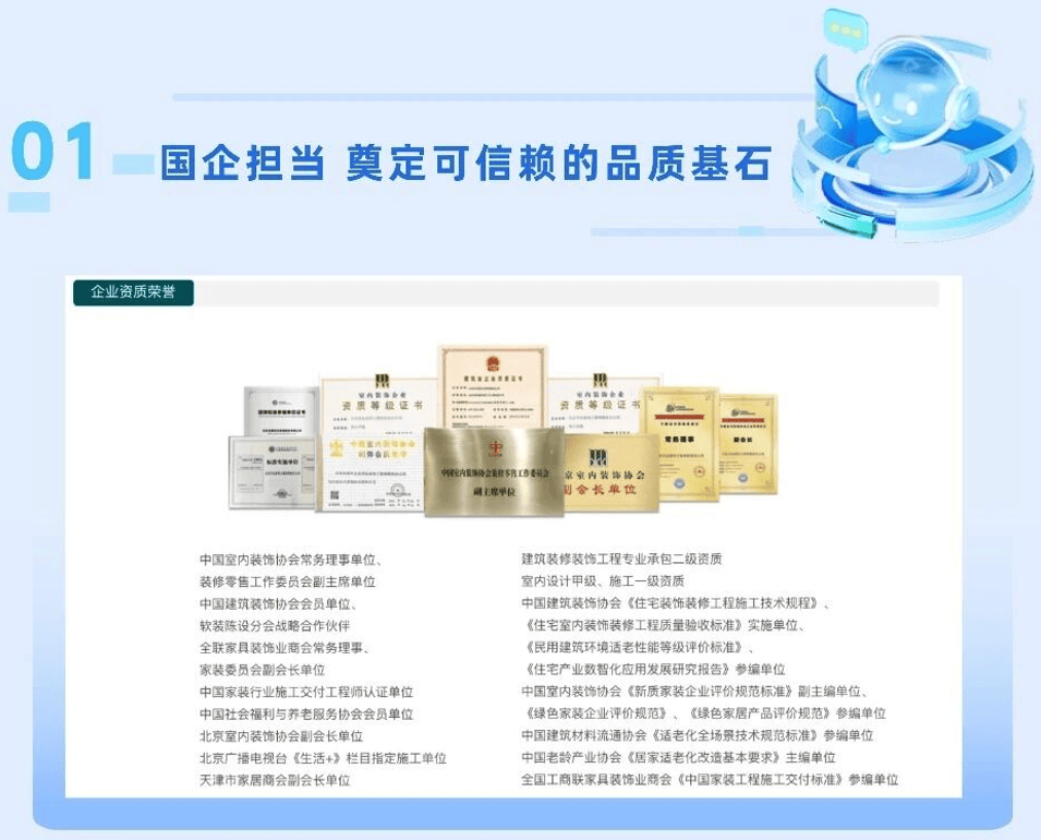 天坛装饰承袭北京金隅天坛家具股份有限公司69年匠心传统,并依托金隅集团的强大综合实力。独特的国企基因,将合规治理、长期信誉与社会责任内嵌于发展脉络。公司不仅是行业市场的参与者,更是规范的推动者,深度参与了《住宅产业数智化应用发展研究报告》、《中国家装工程施工交付标准》等一系列国家及行业标准的制定工作,以自身实践推动行业进步。