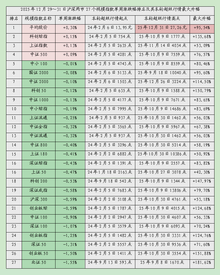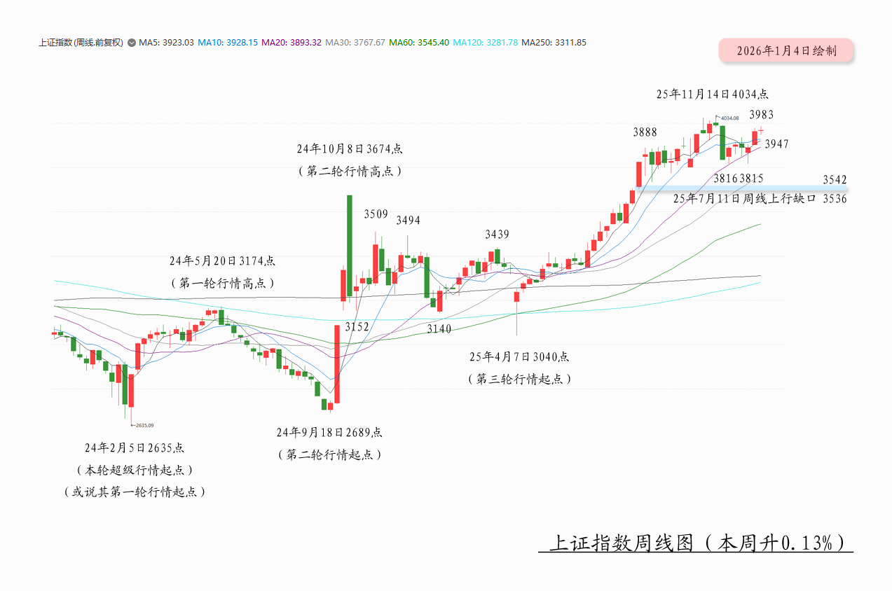 本周(25年12月29~31日)是25年最后一个交易周,因元旦调休之故,只有3个交易日。其间,上证指数高位震荡,最高周一(25年12月29日)3983点,与本轮超级行情迄今最高的25年11月14日4034点只差51点,最低周二(25年12月30日)3947点,最终收于3968点,共计上升5点,升幅为0.13%。