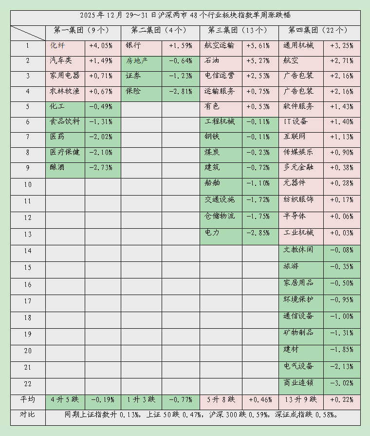 综上所述,本周各大板块群体强弱顺序依次为第三集团、第四集团、第一集团和第二集团。第三集团传统行业蓝筹股多个板块迭创新高。