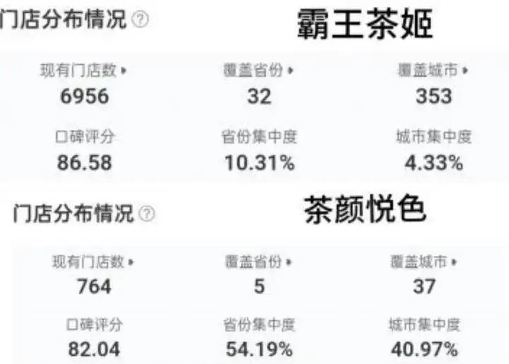 其次,在门店布局上,两者都采取了区域密集开店的策略。茶颜悦色创立7年后于2020年才首次走出湖南,八百多家国内门店主要分布在湖南、湖北、江苏、重庆等省市,湖南本地门店占比依然很高。
