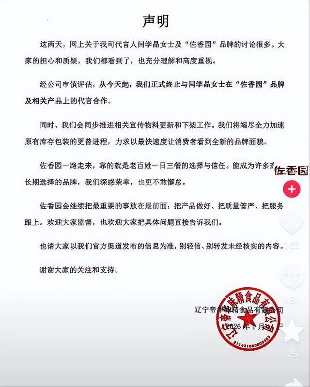 市场反应冷酷而迅速。合作了十年的酱料品牌佐香园,连夜发布声明终止合作,所有印着她头像的包装被紧急撤下。