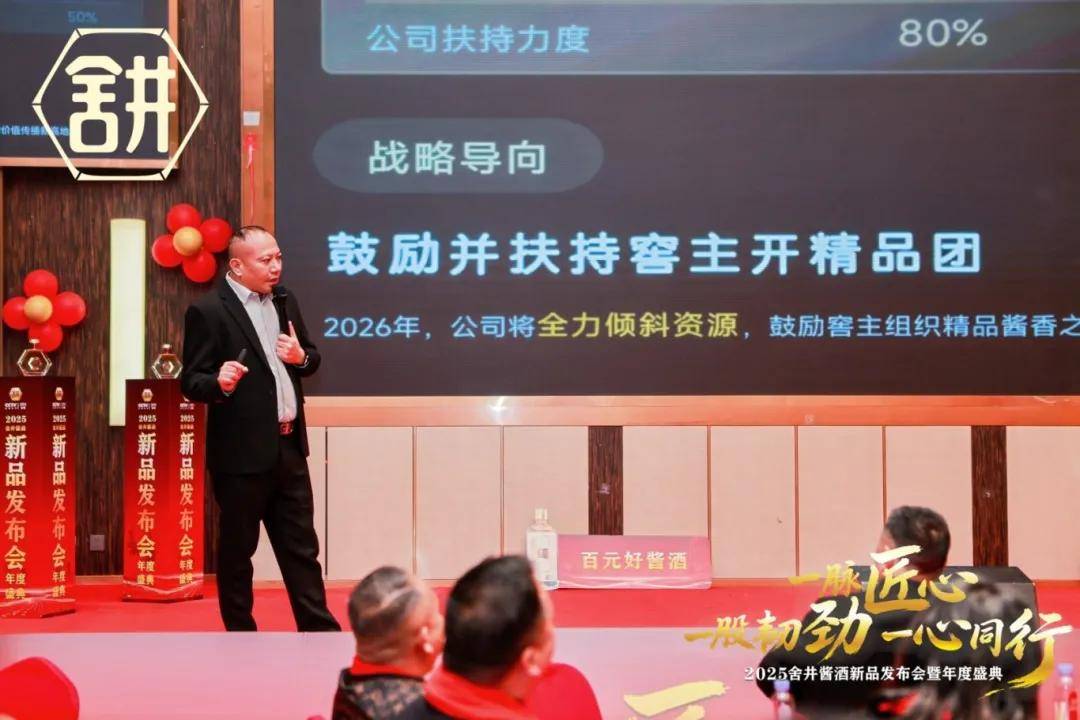 舍井酱酒总经理李前明现场发布了2026年市场赋能战略与新品规划。他表示,公司将全面升级“酱香之旅”沉浸式体验,强化全链路短视频内容赋能,从专业培训、内容模板到投流支持,助力窖主实现“线上引流、线下成交”的完整闭环。