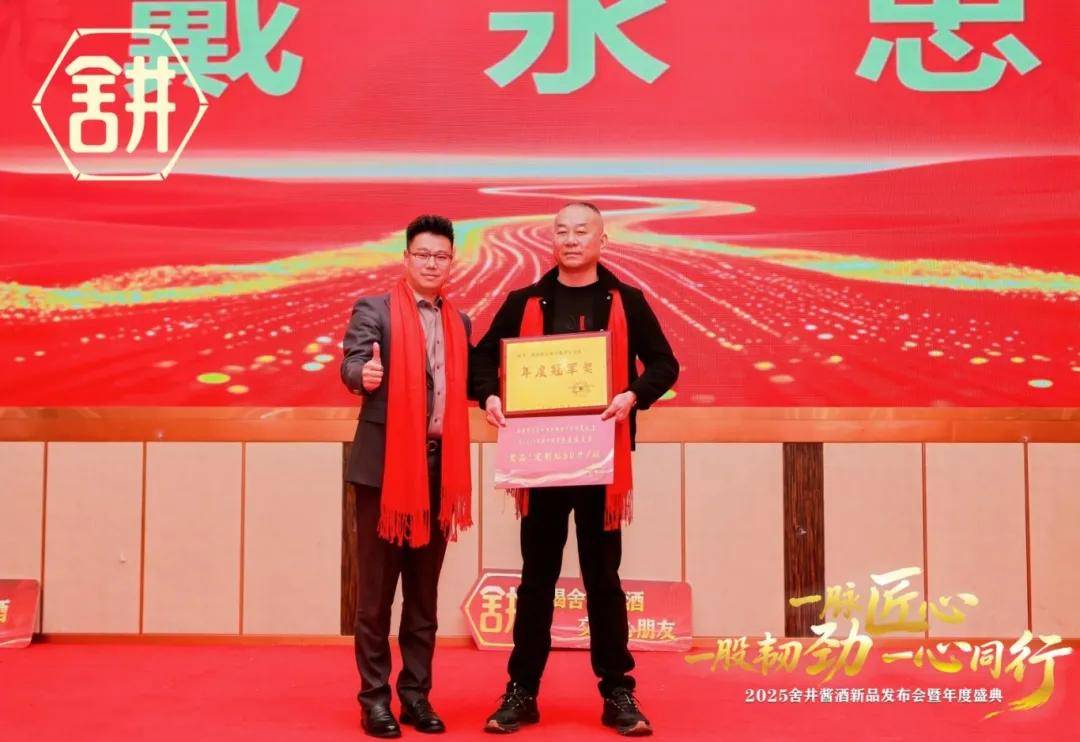典礼的高光时刻,属于年度最具分量的荣誉——“年度冠军奖”。在全体瞩目与热烈掌声中,舍井酱酒董事长陈科建亲自将这一至高奖项授予惠州秋长舍井酱酒文化馆窖主戴永忠,表彰其以绝对领先的市场业绩,树立了舍井酱酒销售的巍峨丰碑!